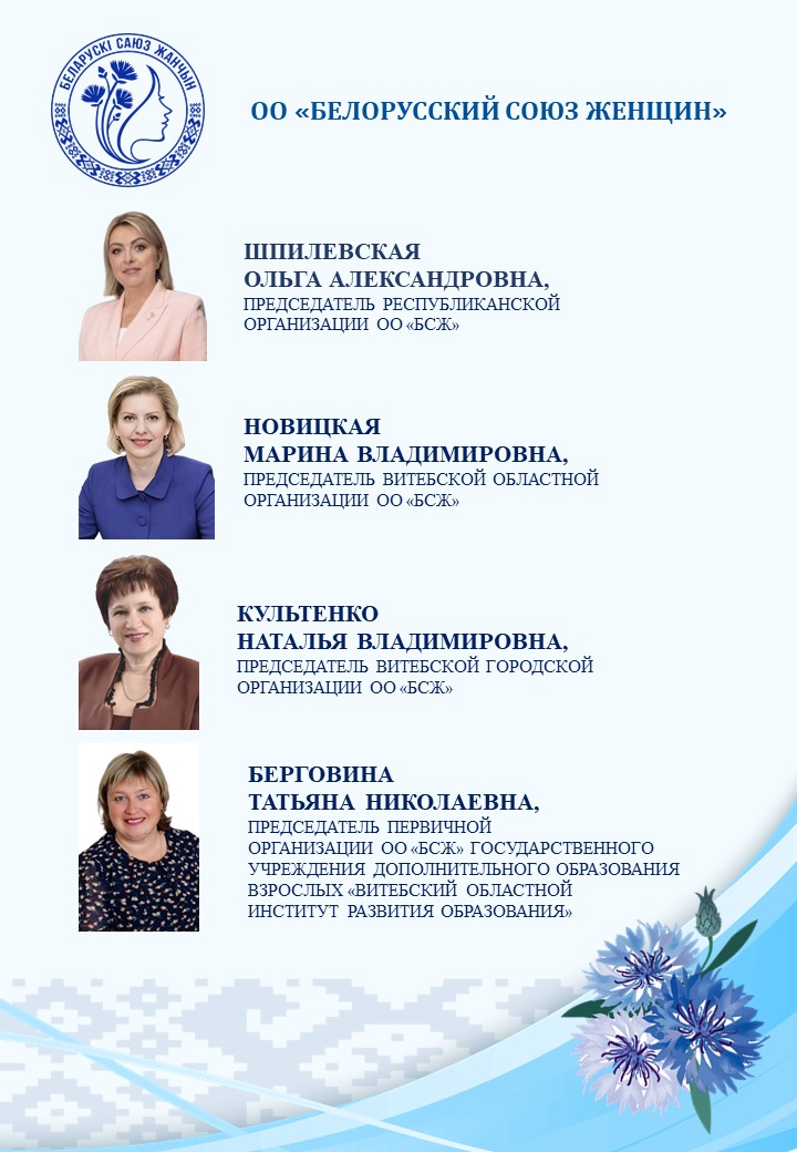 Первичная организация ОО «Белорусский союз женщин» государственного учреждения дополнительного образования взрослых «Витебский областной институт развития образования» поставлена на учет решением администрации Октябрьского района г.Витебска от 17.12.2021 №604 и на добровольной основе объединяет сотрудниц структурных подразделений института. Председатель первичной организации — Берговина Татьяна Николаевна, методист центра дошкольного, общего среднего, специального образования и экспертной деятельности.