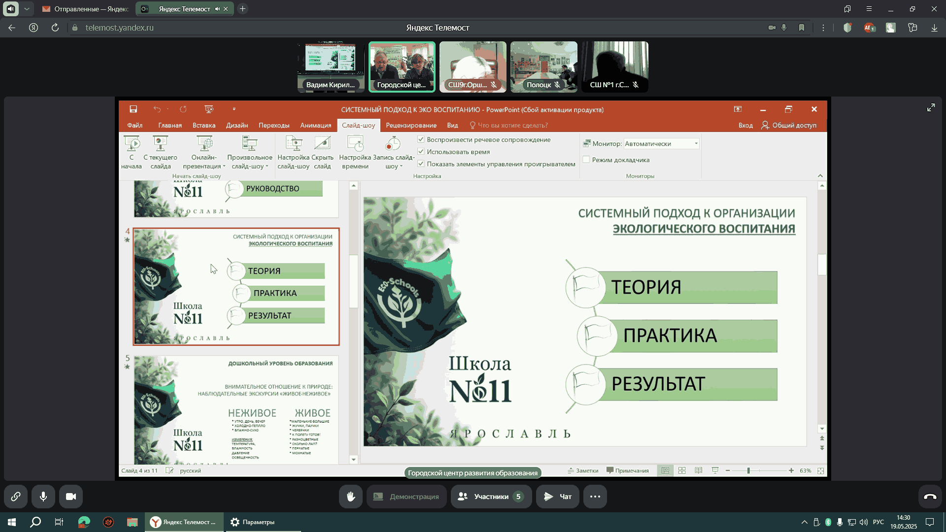 Руководители учреждений образования г.Ярославля Анна Львовна Розина, директор муниципального общеобразовательного учреждения «Средняя школа № 2 имени Л.П.Семеновой», и Николай Евгеньевич Контров, директор муниципального общеобразовательного учреждения «Средняя школа №11», поделились опытом реализации инновационных проектов муниципального (организация и функционирование ресурсного центра «Школа счастья») и международного уровня (реализация международной программы «Эко-школа /Зеленый флаг»).