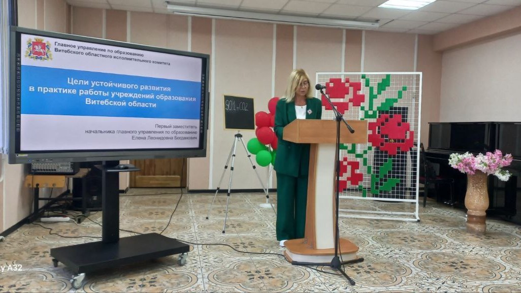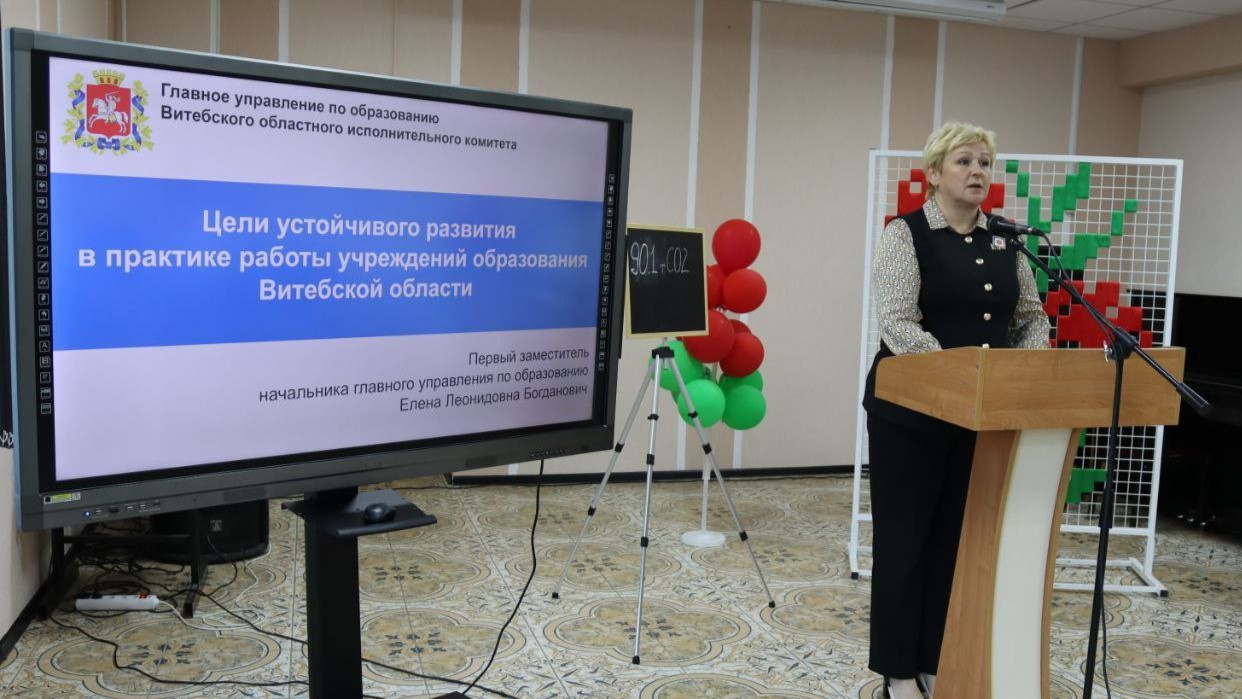 С докладом о целях устойчивого развития в практике работы учреждений образования Витебской области выступила первый заместитель начальника главного управления по образованию Витебского облисполкома Елена Леонидовна Богданович.