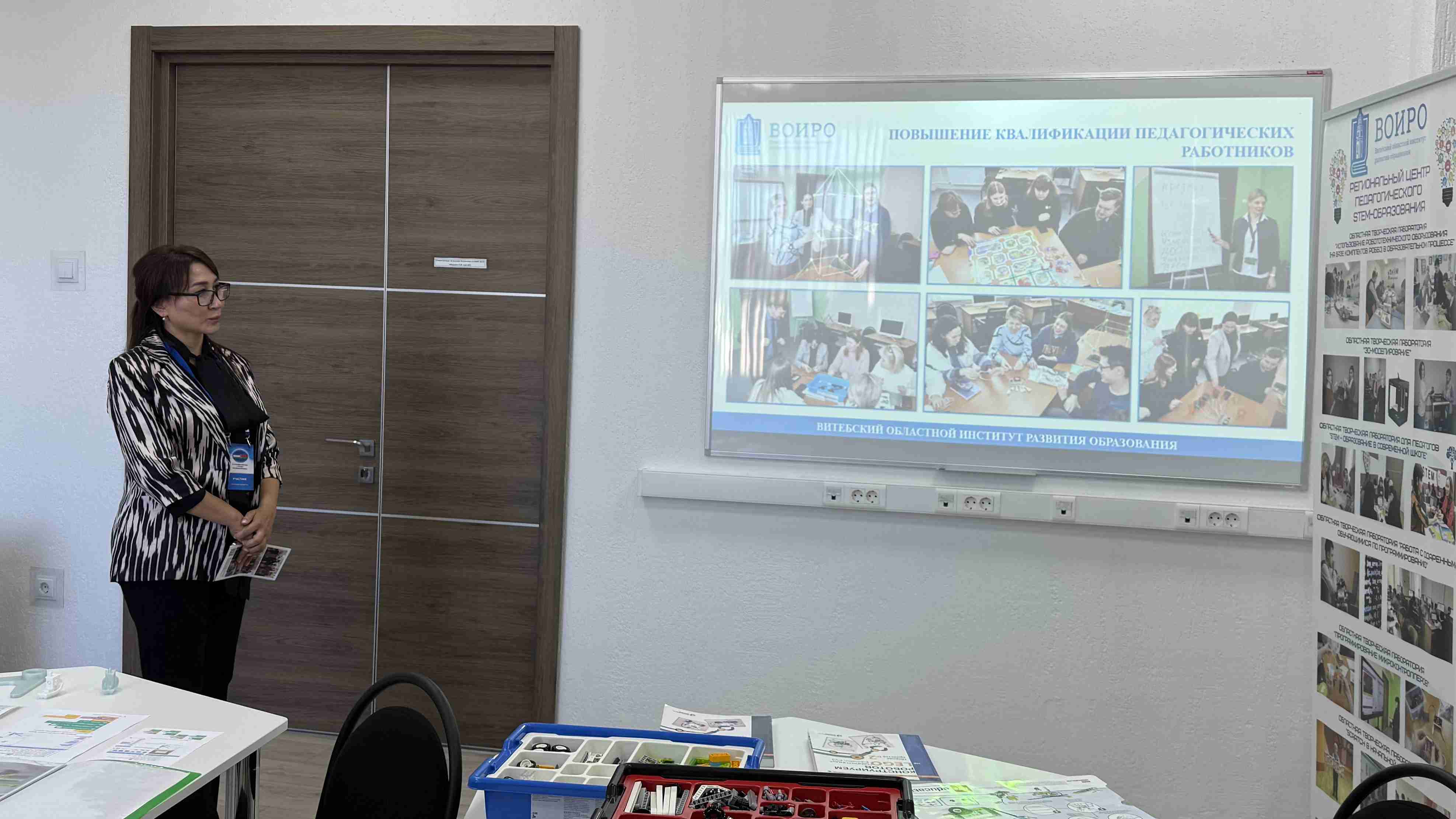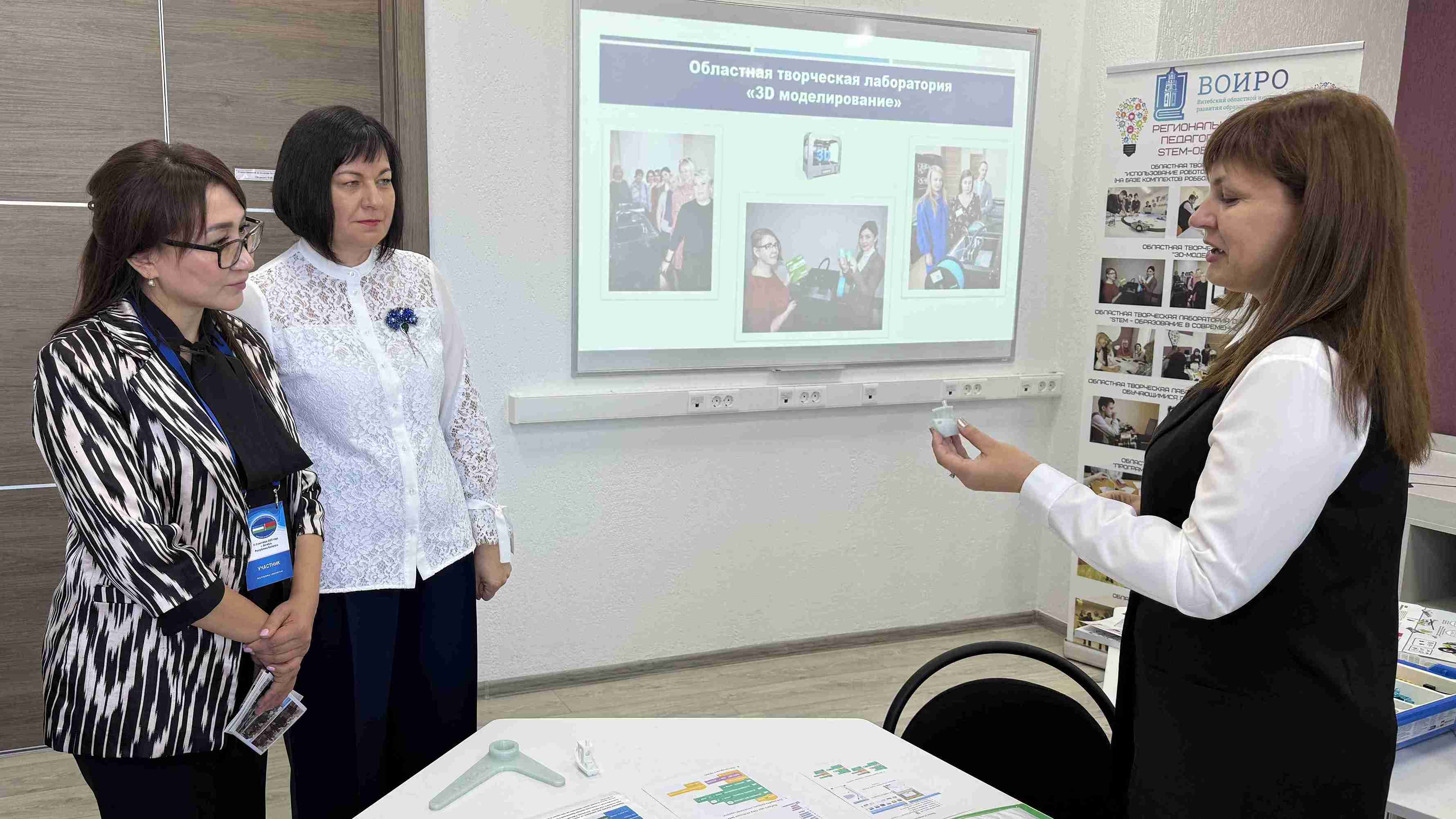 В завершении визита Хилола Махмутовна ознакомилась с работой регионального центра STEM-образования. Начальник центра сопровождения работы с детьми, достигшими высоких показателей в учебной и общественной деятельности, Оксана Ивановна Оборович рассказала об основных локациях STEM-центра, а также о работе классов инженерной направленности учреждений образования Витебской области и инженерно-технических центров, деятельность которых курирует институт.