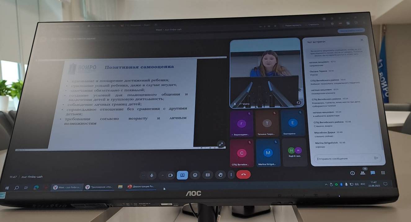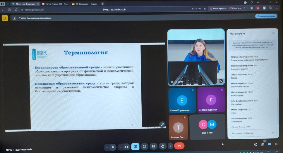 На обучающих курсах (вебинаре) «Формирование безопасной психологической среды в учреждении образования» Евгения Игоревна Совейко, кандидат педагогических наук, доцент кафедры педагогики, частных методик и менеджмента образования, поделилась со слушателями опытом создания безопасной психологической среды, упражнениями и играми для формирования доверия и уважения. Были освещены вопросы угроз психологической безопасности в педагогическом общении, рассмотрены рекомендации по решению возникающих у обучающихся конфликтов в ученическом коллективе и педагогическом общении.