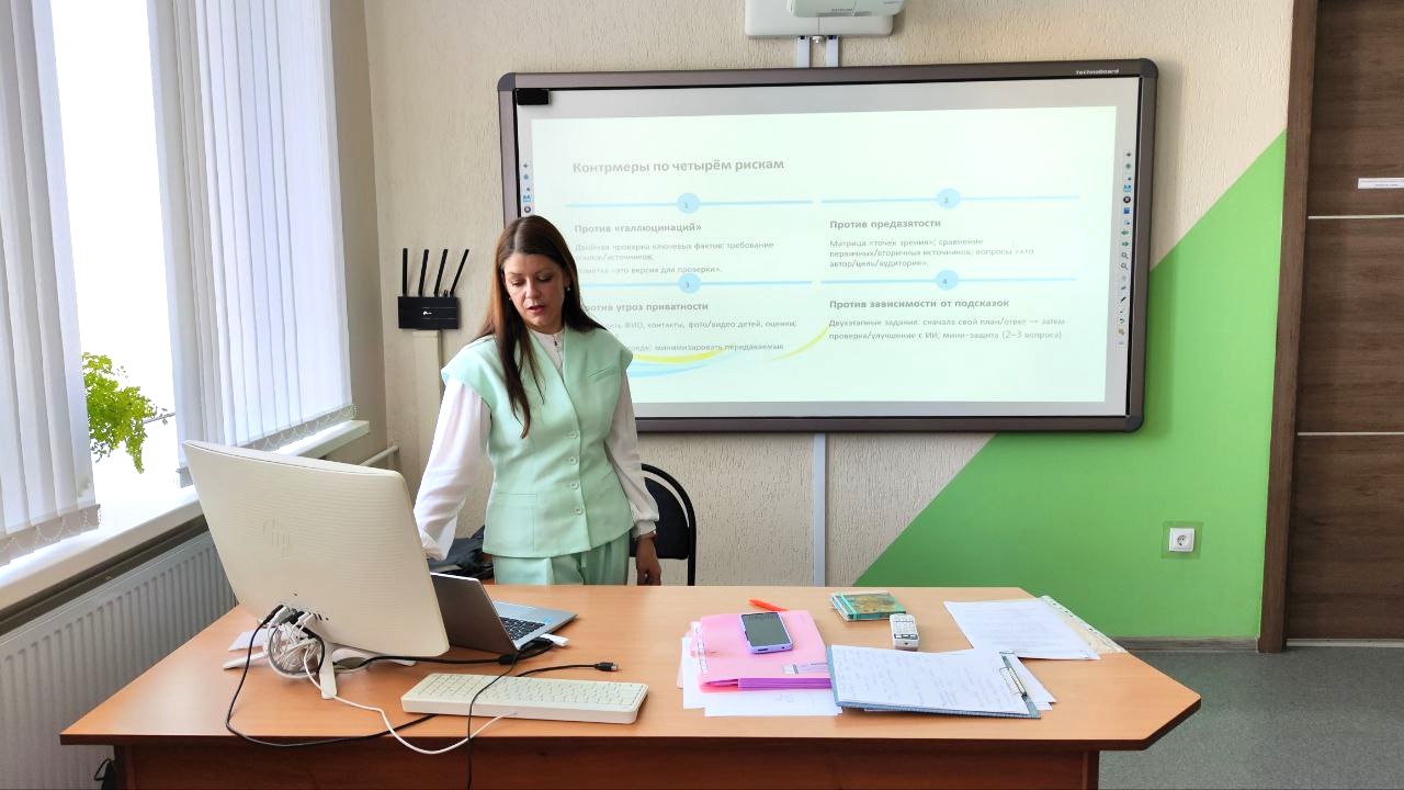 Обучение носило практико-ориентированный характер. Своим практическим опытом с педагогами поделилась Олеся Викторовна Королёва, учитель русского языка и литературы высшей квалификационной категории ГУО «Гимназия №8 г.Витебска», член республиканской творческой группы «Использование искусственного интеллекта в образовательном процессе», участник постоянно действующего семинара «Практическое применение технологии «Искусственный интеллект» в образовательном процессе», организованного Парком высоких технологий.