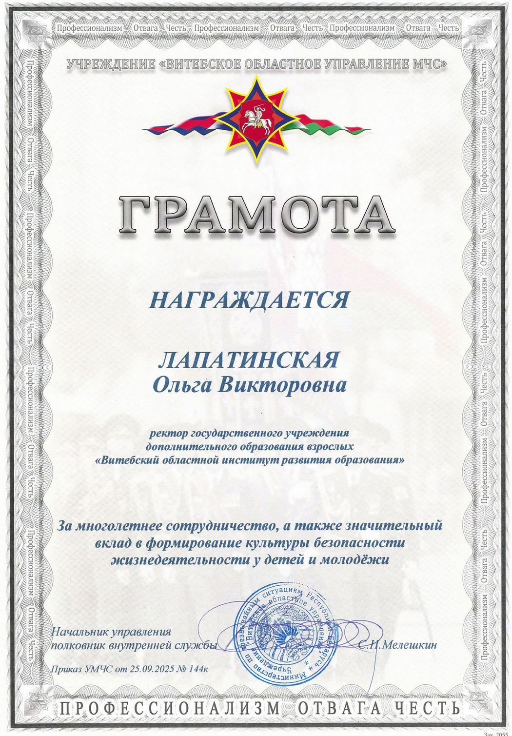 В рамках мероприятия ректор института Ольга Викторовна Лапатинская была награждена грамотой Витебского областного управления МЧС за многолетнее сотрудничество, а также значительный вклад в формирование культуры безопасности жизнедеятельности у детей и молодёжи.