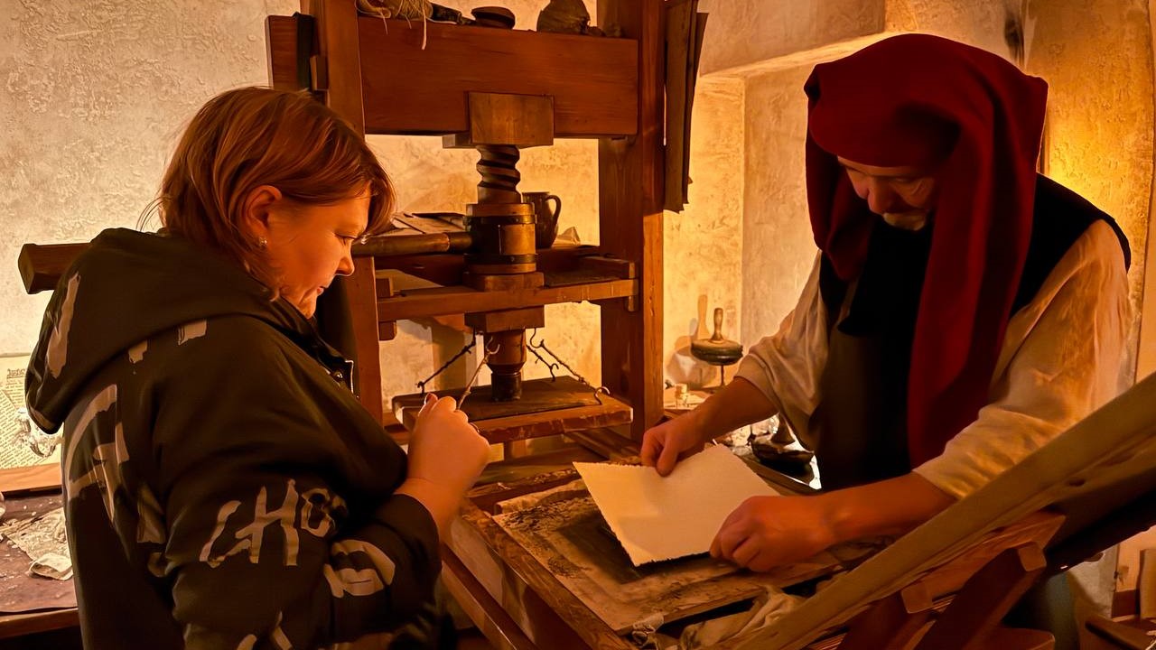 В Музее средневекового рыцарства и в Доме печатника прошли интерактивные экскурсии: участники увидели доспехи и артефакты эпохи, а также сами изготовили копию старинной рукописи на печатном станке.