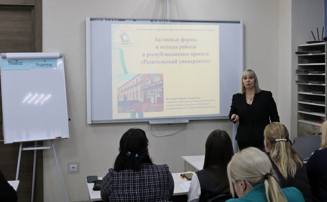 Заместитель директора по воспитательной работе ГУО «Средняя школа №12 г.Орши» Марина Эдуардовна Белонович представила формы и методы взаимодействия с родителями, отметив, что использование как традиционных, так и нетрадиционных практик приводит к положительным результатам взаимодействия с родителями.