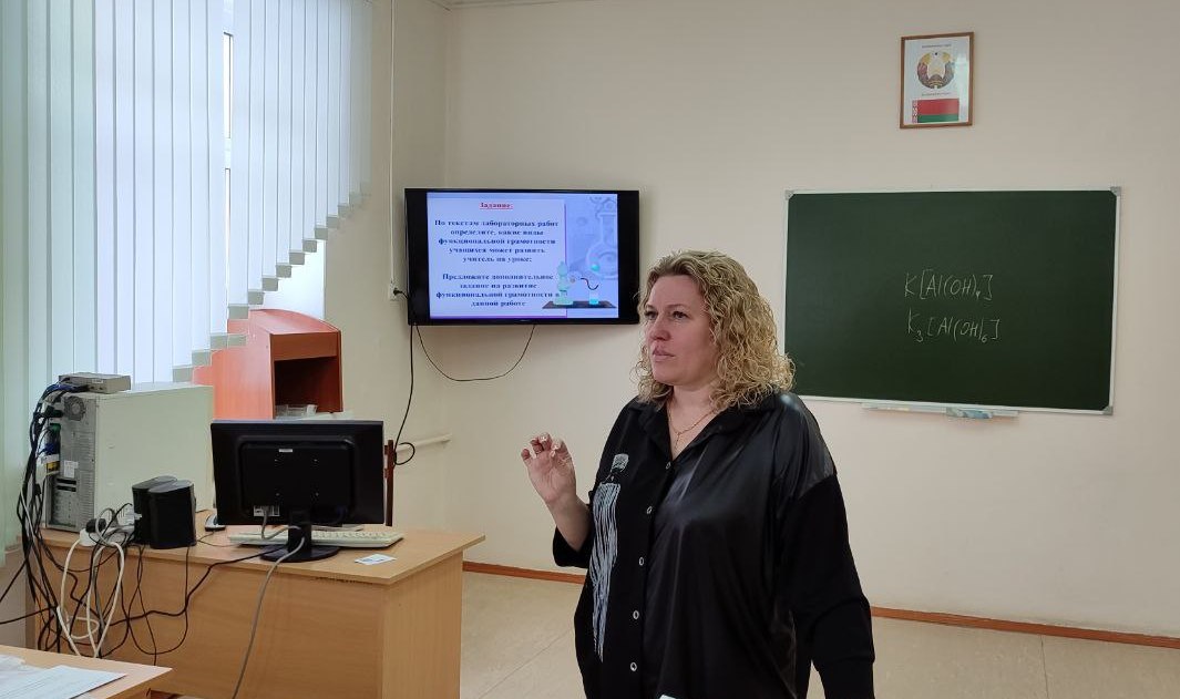 Практическим опытом со слушателями поделилась Елена Викторовна Нарушевич, учитель химии ГУО «Средняя школа № 40 г. Витебска имени М.М. Громова». В рамках её занятий рассматривались нормативное правовое обеспечение преподавания химии, а также эффективные методы формирования функциональной грамотности учащихся при проведении лабораторных и практических работ.