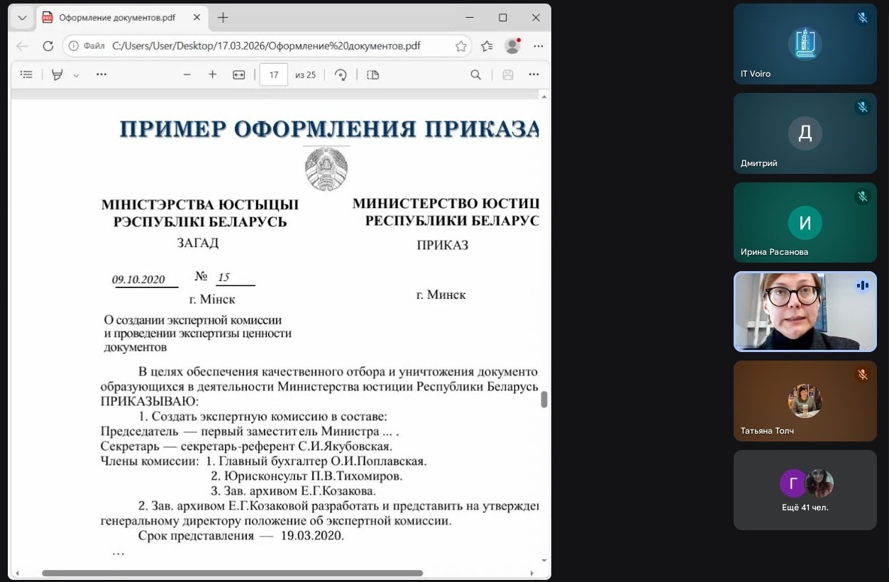 Участниками вебинара стали секретари, делопроизводители и инспекторы по кадрам учреждений образования. В роли спикера выступила Ольга Павловна Гаврильчик, заведующий отделом формирования Национального архивного фонда учреждения «Государственный архив Витебской области», которая подробно осветила ключевые аспекты современного делопроизводства.