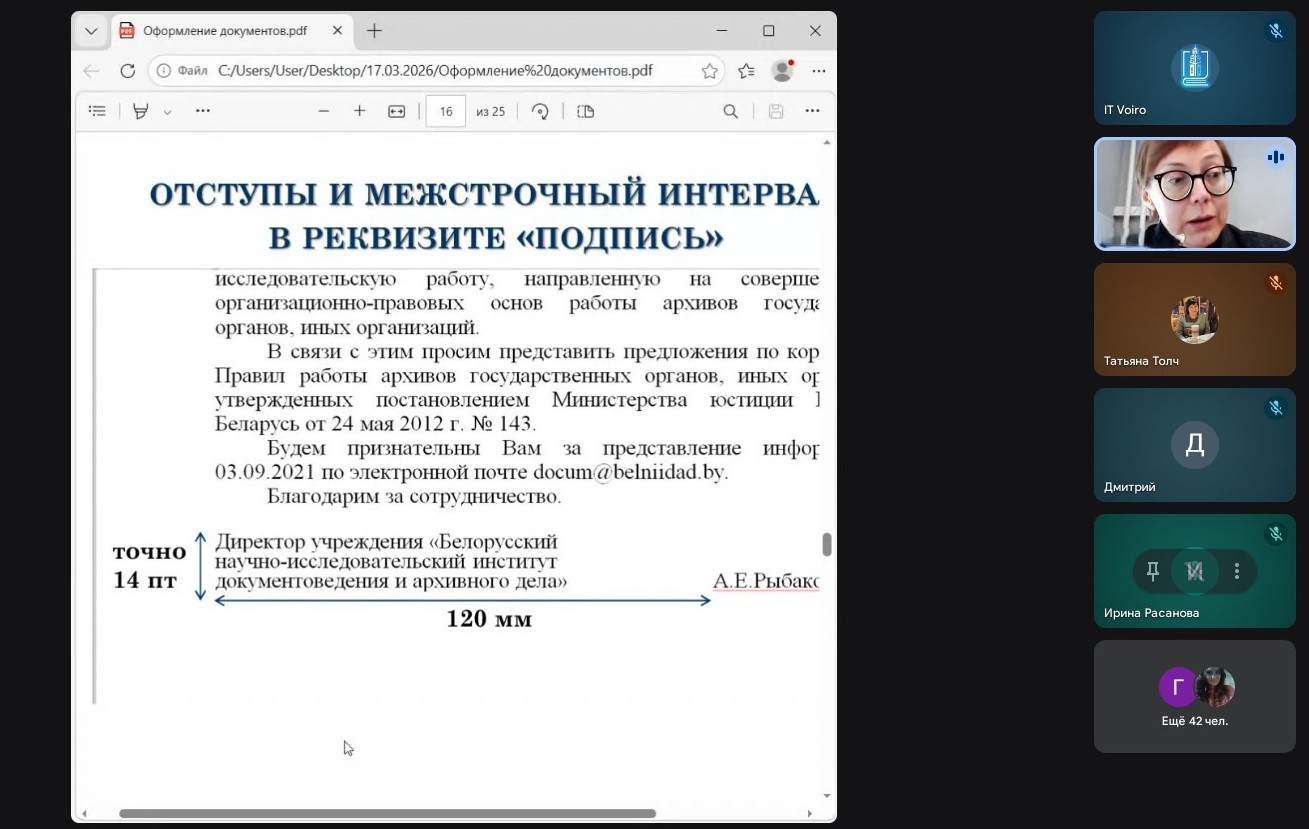 В ходе обучения Ольга Павловна актуализировала знания нормативных правовых документов, познакомила слушателей с особенностями оформления отдельных видов документов в учреждениях образования и рассмотрела проблемные аспекты работы с электронными документами. Также были даны рекомендации по организации эффективного документооборота и разработке локальной инструкции по делопроизводству.