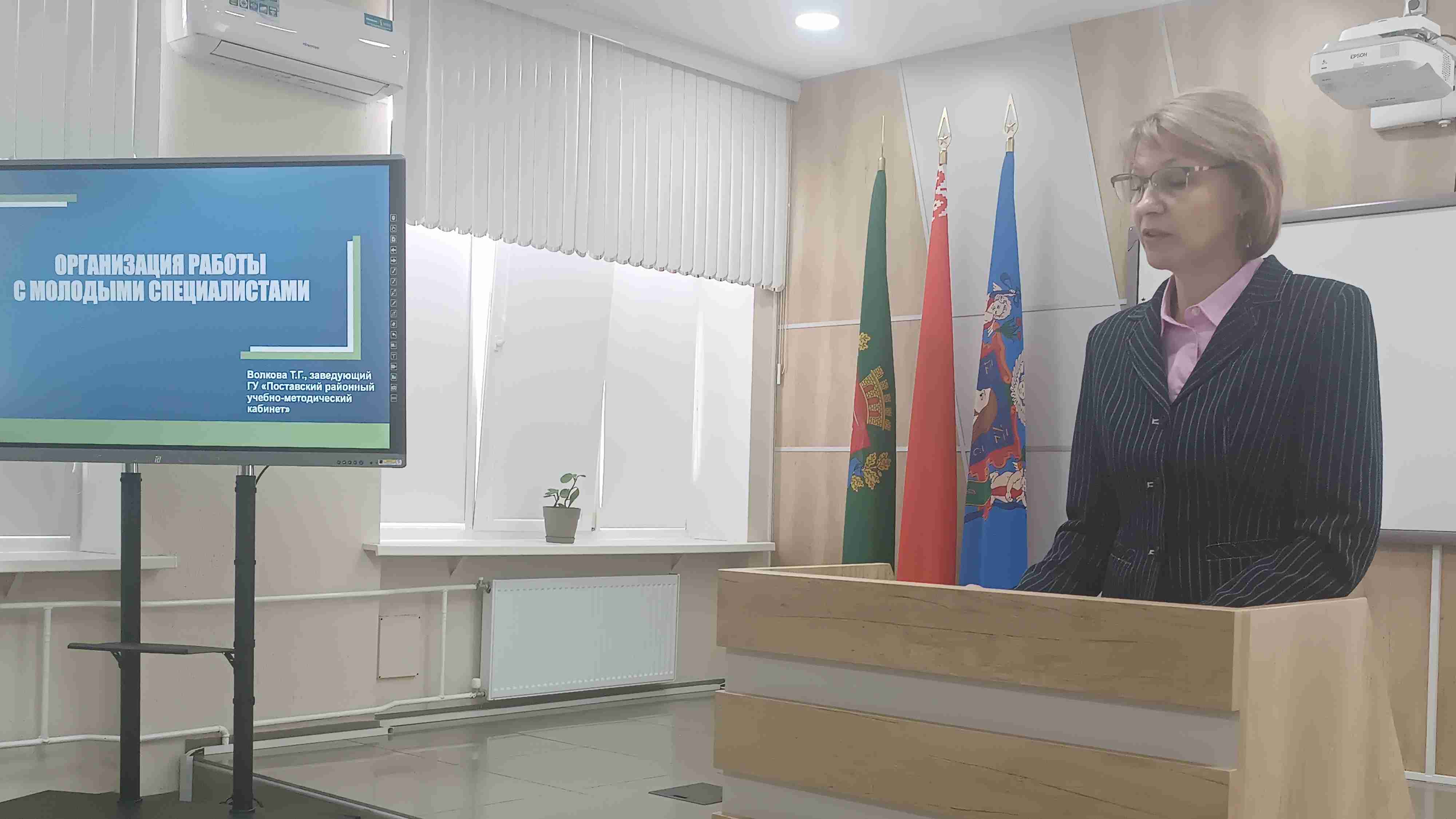 Опыт деятельности по адаптации молодых педагогов на первом рабочем месте представила заведующий ГУ «Поставский районный учебно-методический кабинет» Татьяна Геннадьевна Волкова. Татьяна Геннадьевна подчеркнула, что большое значение в работе с начинающими педагогами имеет индивидуальный подход, применение разнообразных форм работы и способов взаимодействия с педагогической молодежью.