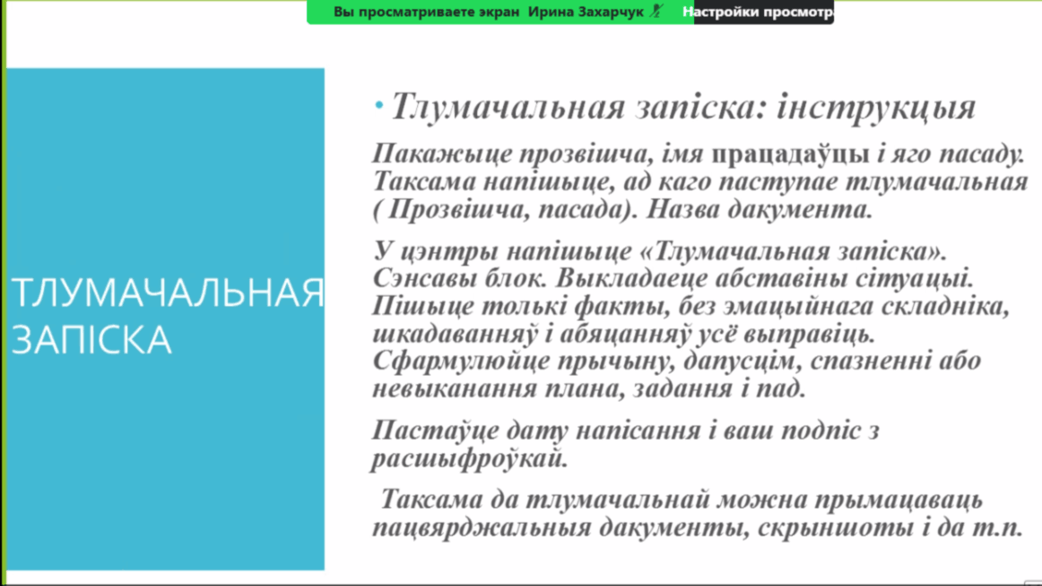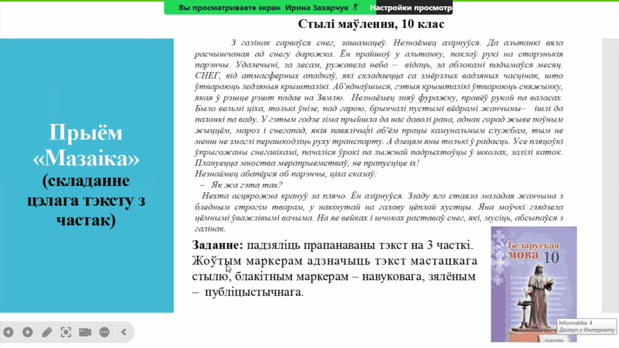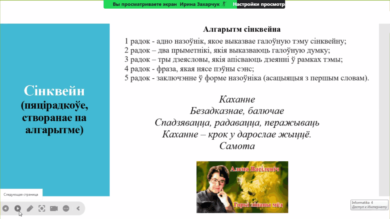 Вебінар правяла Ірына Уладзіміраўна Захарчук, настаўнік беларускай мовы і літаратуры кваліфікацыйнай катэгорыі "настаўнік-метадыст" ДУА "Сярэдняя школа № 2 г.Слоніма".